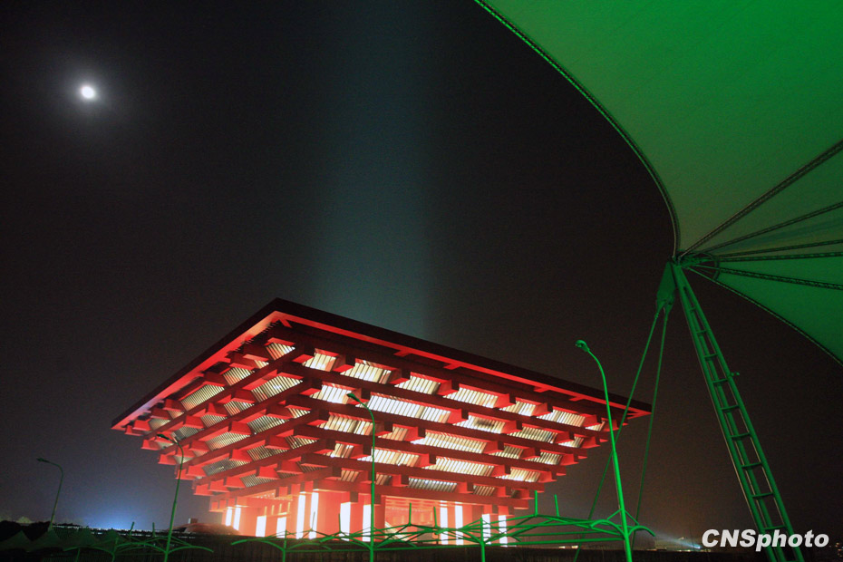上海世博园“一轴四馆”灯火通明,中国馆、世博主题馆,世博中心、阳光谷等同时亮灯。中新社发 潘索菲 摄