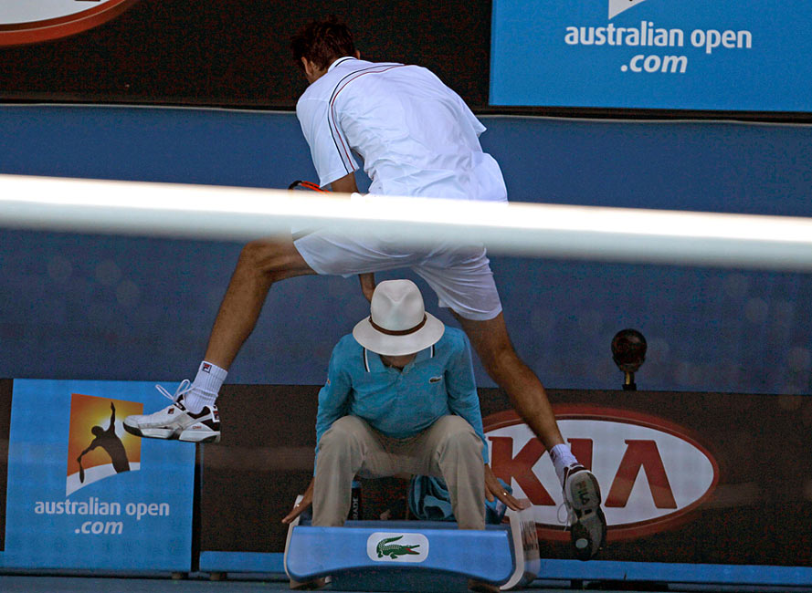 在澳网男子四分之一决赛上,克罗地亚选手西里奇(Marin Cilic)在对阵美国选手罗迪克(Andy Roddick)时为救球从边裁头顶跳过。