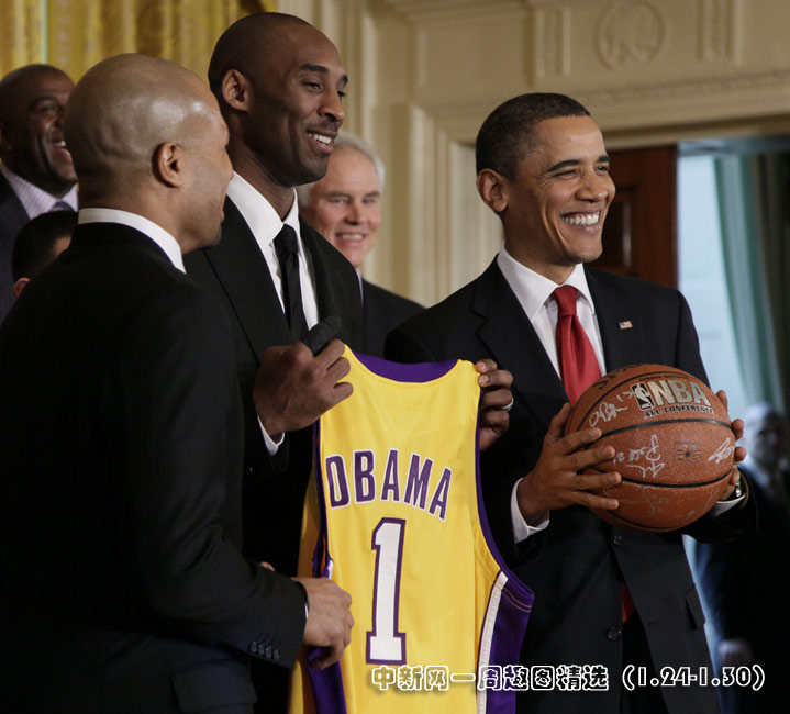 1月25日,在美国首都华盛顿的白宫,美国总统奥巴马会见了上赛季NBA总冠军洛杉矶湖人队教练和球员。图片来源:中国新闻网>>点击观看详细内容