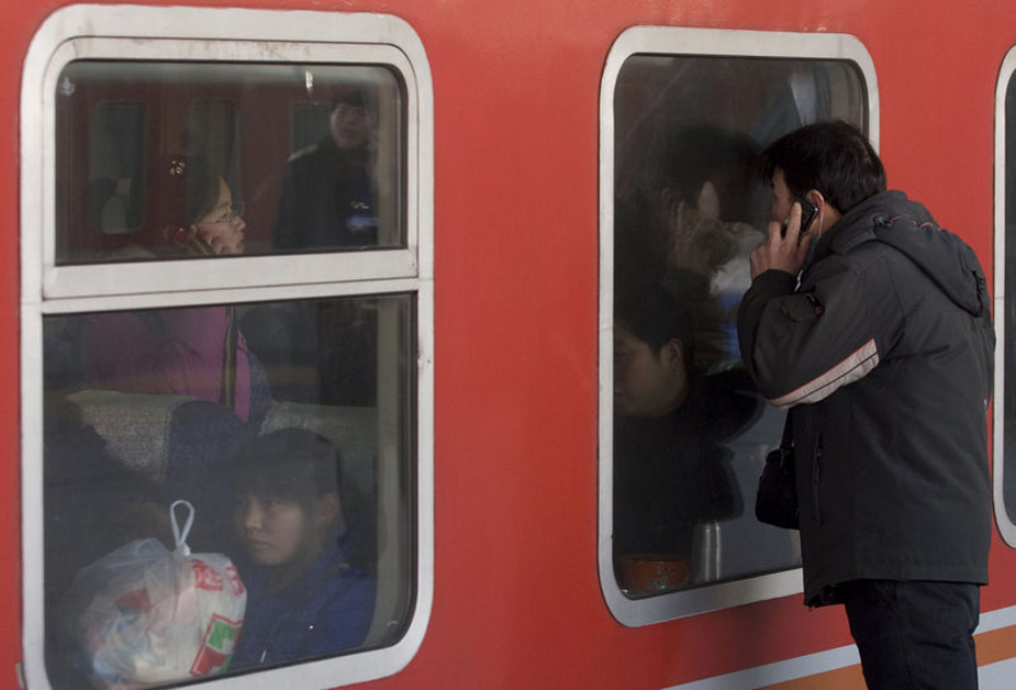 一年一度的春运今日起正式开始。2010年的春运从1月30日起至3月10日,为期40天,其中节前15天,节后25天。据权威预测,今年春运客运量料超25亿人次。图为一个男子在和已经上了车的女朋友打电话,嘱咐她看好行李。吴家翔 摄