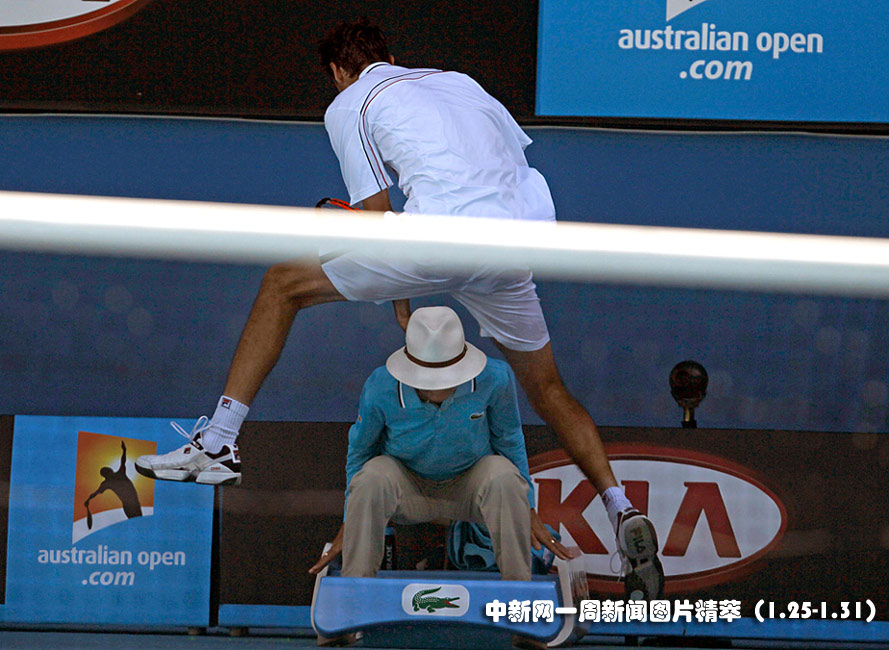 1月26日(周二),在澳网男子四分之一决赛上,克罗地亚选手西里奇(Marin Cilic)在对阵美国选手罗迪克(Andy Roddick)时为救球从边裁头顶跳过。图片来源:中国新闻网