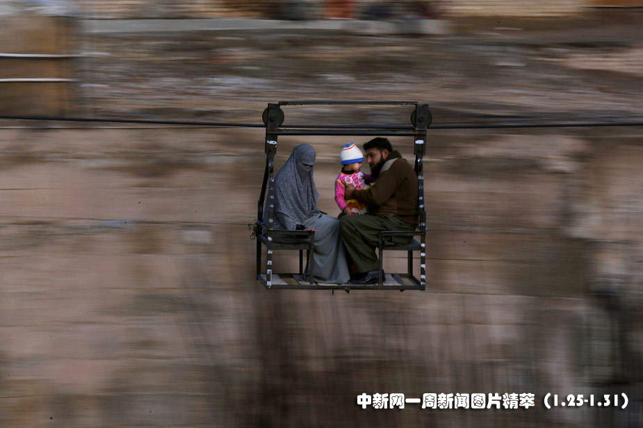 1月29日(周五),巴基斯坦,一家三口正在搭乘绳索过桥。图片来源:中国新闻网