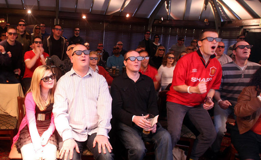 英国曼彻斯特,09/10英超第24轮,阿森纳Vs曼联,曼联球迷观看3D直播。北京时间2月1日,英国体育频道首次使用3D技术对阿森纳与曼联的比赛进行电视直播。据悉,今年南非世界杯也将进行3D转播。