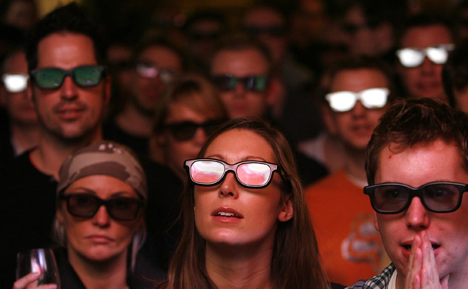 图为球迷在伦敦的酒吧里享受3D足球直播。北京时间2月1日,英国体育频道首次使用3D技术对阿森纳与曼联的比赛进行电视直播。据悉,今年南非世界杯也将进行3D转播。