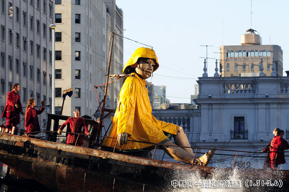 近日,智利首都圣地亚哥街头,法国一剧团携巨型提线木偶“小巨人”上街表演,它惟妙惟肖的表情和逼真的神态引得周围观众的阵阵掌声。图片来源:中国新闻网>>点击观看详细内容