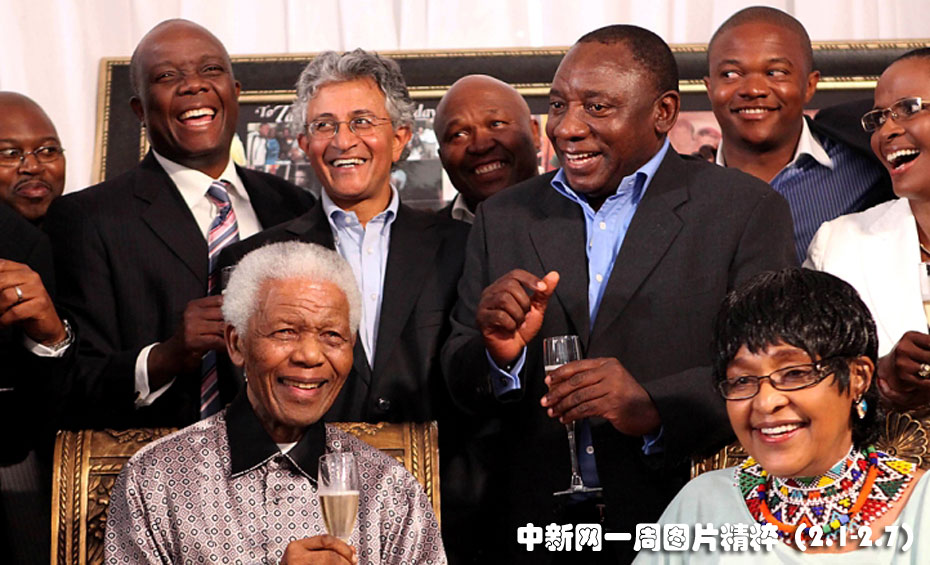 2月4日(周四),南非前总统曼德拉与前妻维尼在约翰内斯堡与家人和支持者共同庆祝曼德拉获释二十周年。图片来源:中国新闻网