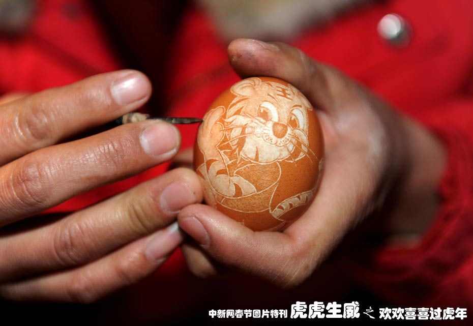 1月12日,家住合肥市瑶海区化南社区的火车司机王剑正在进行“蛋雕虎”创作。上海铁路局合肥机务段的火车司机王剑,从小酷爱美术,业余从事蛋雕雕刻10余年,随着农历虎年临近,他以鸡蛋壳为原料创作出一系列造型多样,栩栩如生的“蛋雕虎”作品,以此表达对虎年的美好期望与祝福。中新社发 解琛 摄