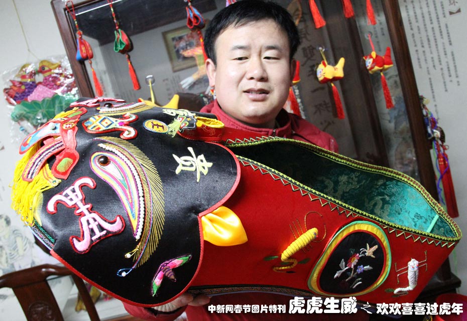 1月18日,南京民间艺人高勇与父母一起花费三个月时间制作了一只长80厘米、高35厘米的虎头鞋,日前亮相南京市民俗博物馆。据悉,改鞋共用丝绸3.5米,耗费金丝线、丝线和棉线约750米。中新社发 阿董 摄