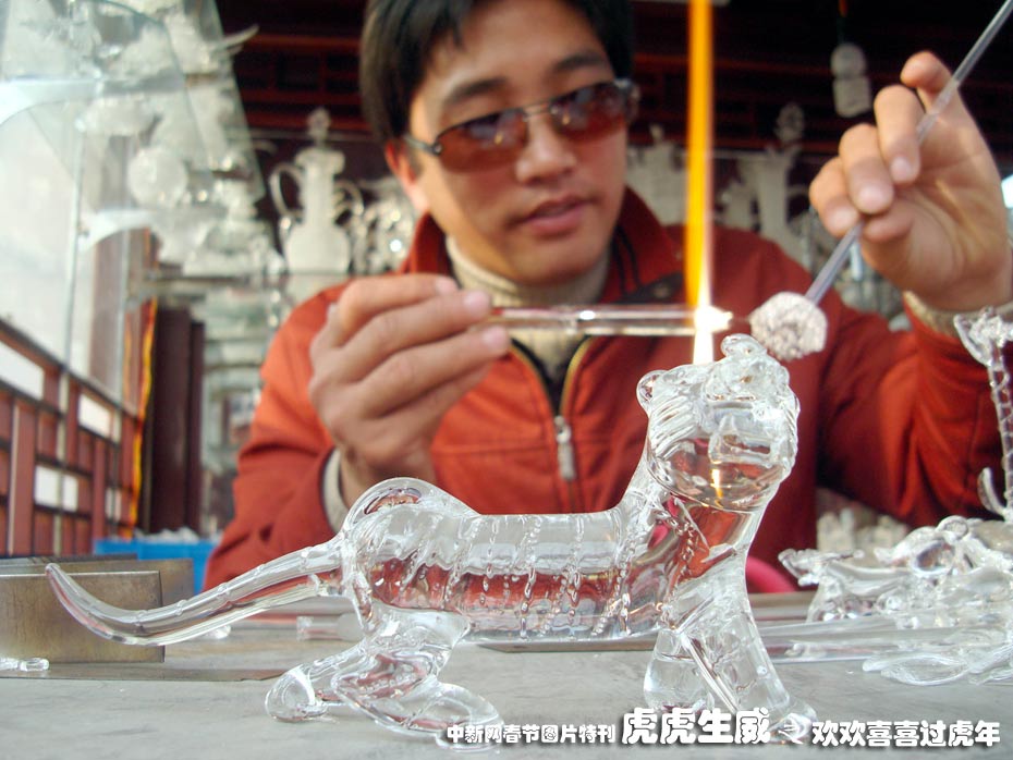 1月29日,苏州市民间艺人马强在工艺亭里利用玻璃拉丝绝技烧制而成的生肖虎饰品,造型逼真,吸引了众多游人的目光。中新社发 王建康 摄