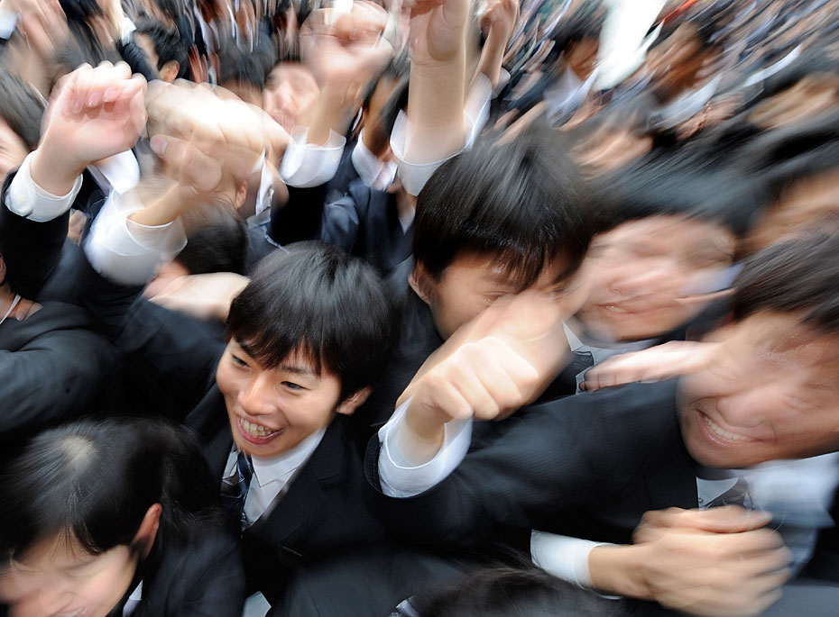 2月10日,日本东京职业学校的学生在求职动员会上伸出拳头展现信心。日本的失业率达5%,2011届毕业生将面临严峻就业形式。图片来源:中国新闻网