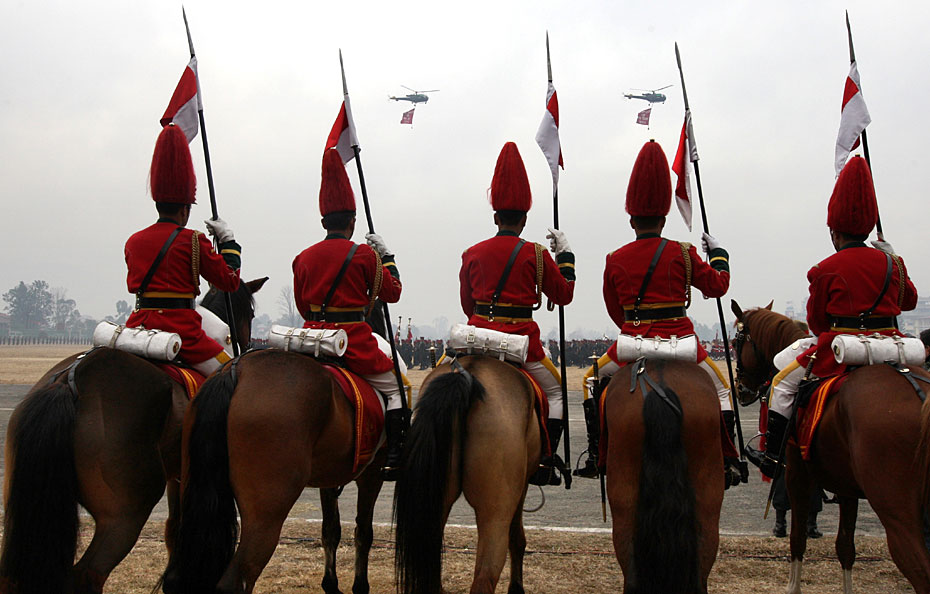 当地时间2月12日,尼泊尔士兵在首都加德满都举行了建军节阅兵式。尼泊尔总统和总参谋长检阅了受阅部队。图片来源:中国新闻网