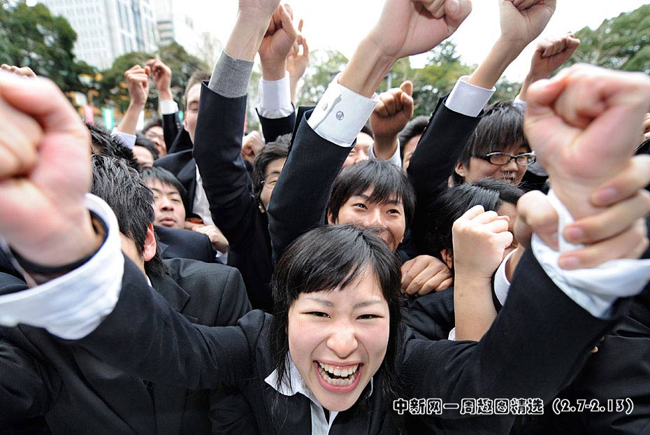 2月10日,日本东京职业学校的学生在求职动员会上伸出拳头展现信心。日本的失业率达5%,2011届毕业生将面临严峻就业形式。图片来源:中国新闻网>>点击观看详细内容