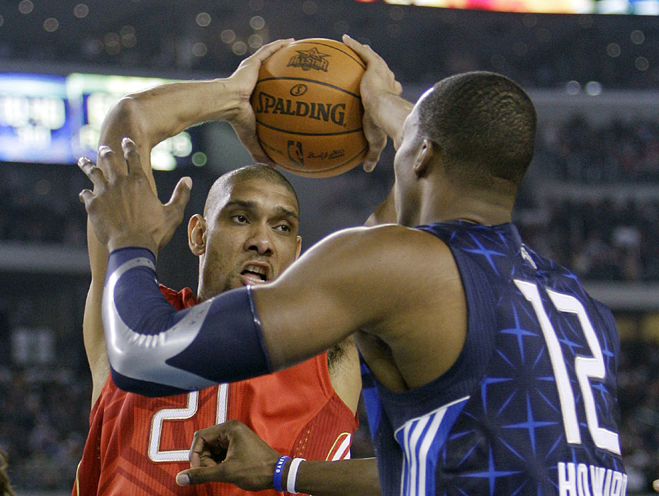 图为西部明星队球员企图将球出手。