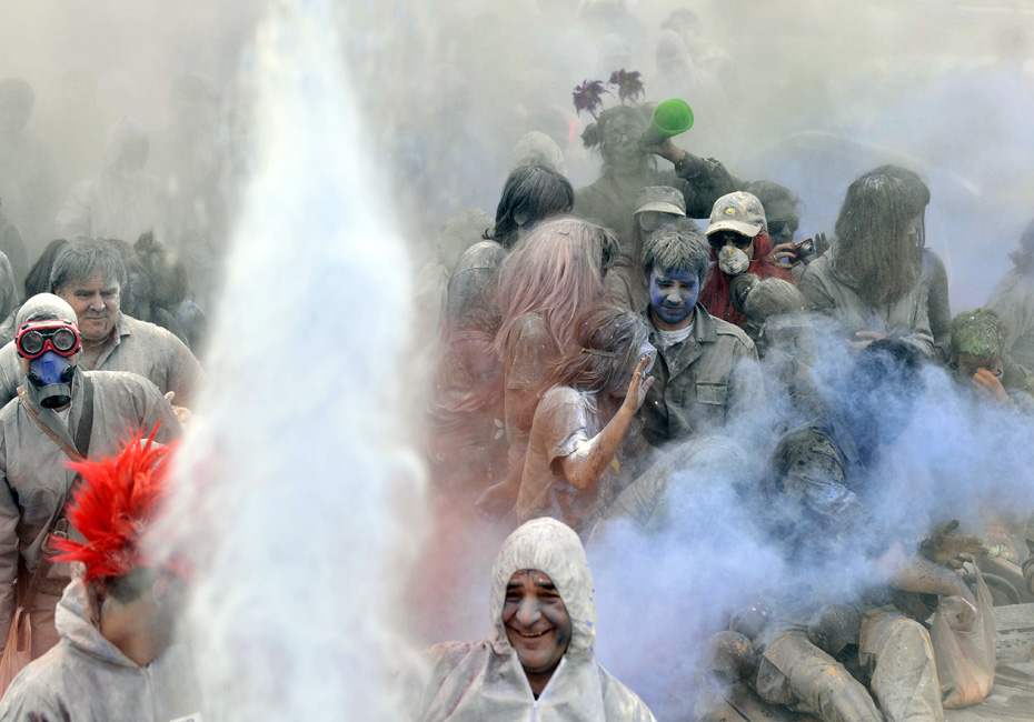 2月15日,希腊港口加拉西迪,狂欢者在街头参加“面粉大战”。“面粉大战”是当地庆祝狂欢季结束的一项传统活动,随后将是为期40天的斋戒月直至复活节。图片来源:中国新闻网