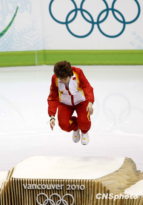 2010年温哥华冬奥会短道速滑女子500米决赛北京时间2月18日上午11时许举行,中国选手王濛获得冠军,成为中国冬奥历史上第一位成功卫冕的冠军,中国队也实现了这个项目的冬奥三连冠。图为王濛“飞”上领奖台。中新社发 盛佳鹏 摄 图片来源:中国新闻网