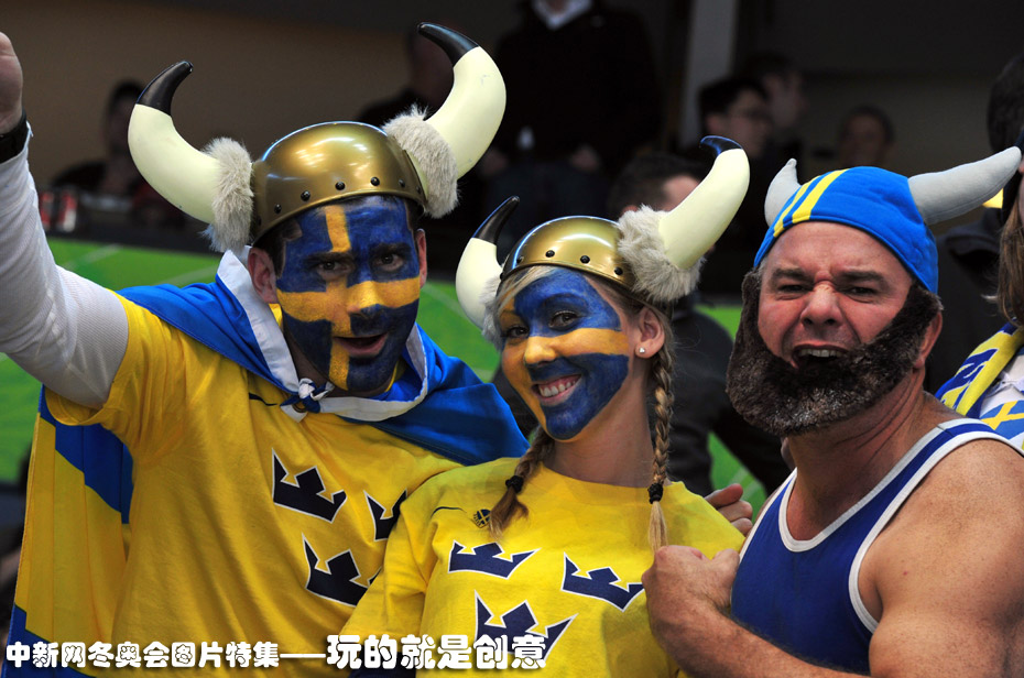 图为冰球赛场上快乐的瑞典球迷。图片来源:中国新闻网