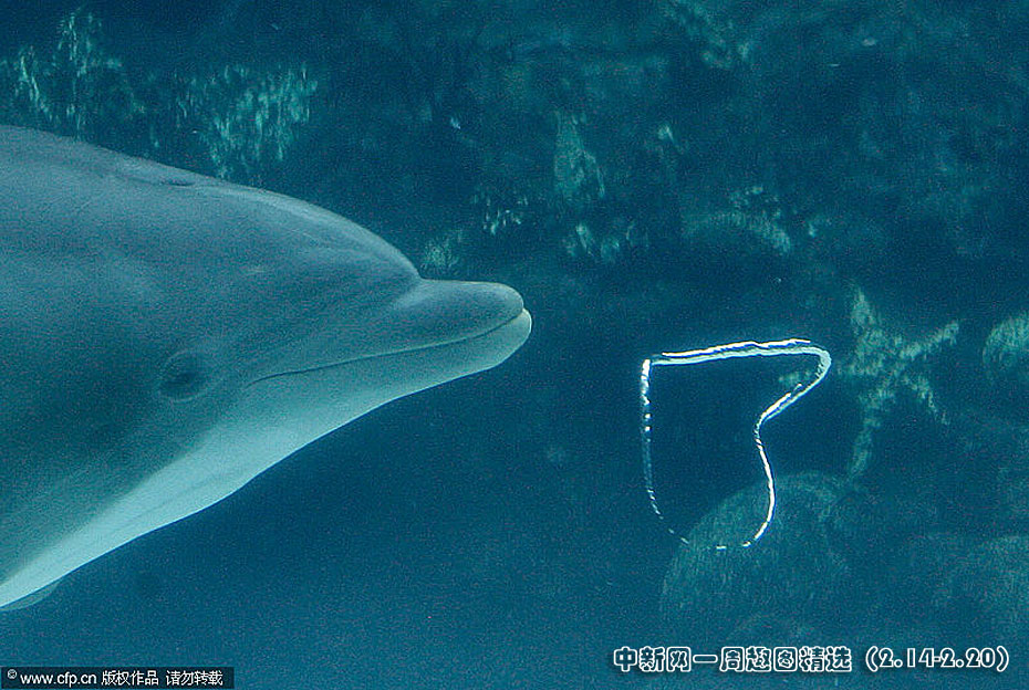 近日,美国奥兰多海洋世界的一只宽吻海豚吹出“心形”气泡,似乎要在情人节来临前夕传达浓浓爱意。图片来源:CFP>>点击观看详细内容