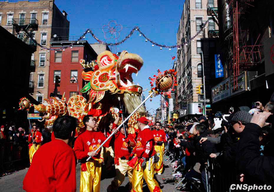 虎年纽约华埠庆祝农历新年“重头戏”花车大游行21日登场,吸引超过10万人围观共同狂欢,成为历年来参加人数最多的一次花车游行。12辆盛装花车以及数千人的表演团队沿着华埠最热闹的数十条街道一边行进一边表演,满天彩带飘扬,场面热闹非常。中新社发 魏晞 摄