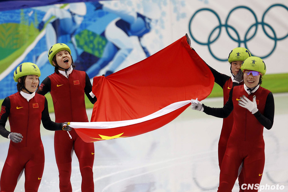 当地时间2月24日,温哥华冬奥会女子短道速滑3000米接力A组决赛中,中国队王濛、周洋、孙琳琳、张会四朵金花联袂出击,最终将金牌归入中国队囊中。图片来源:中国新闻网