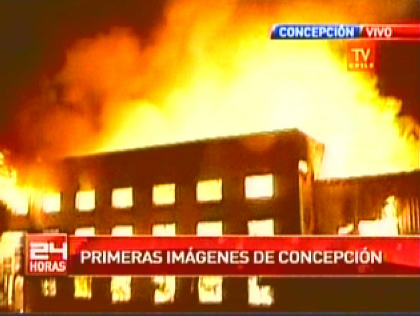 美国地震勘测局报告称,智利康塞普西翁省附近当地时间27日凌晨发生里氏8.8级强烈地震,首都圣地亚哥有明显震感。智利总统巴切莱特已宣布国家进入“灾难状态”。目前强烈地震造成的死亡人数已经升至78人。视频截图显示在智利康塞普西翁,地震破坏严重,火光冲天。