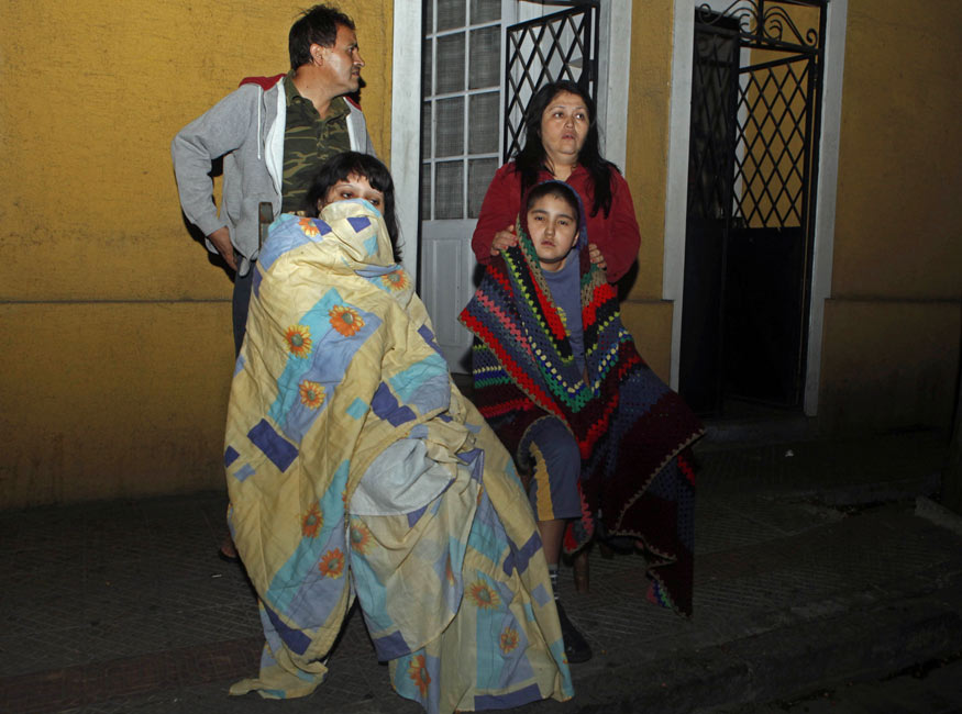 美国地震勘测局报告称,智利康塞普西翁省附近当地时间27日凌晨发生里氏8.8级强烈地震,首都圣地亚哥有明显震感。智利总统巴切莱特已宣布国家进入“灾难状态”。目前强烈地震造成的死亡人数已经升至78人。图为在智利首都圣地亚哥,正在熟睡中的人们感到地震后纷纷走到户外。