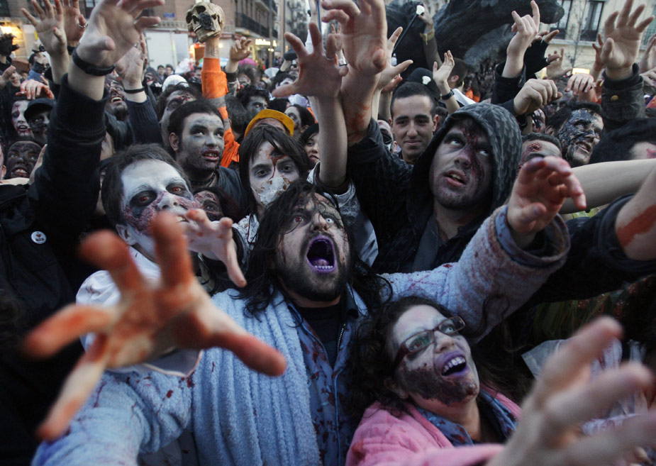 当地时间2月27日,在西班牙马德里,众多爱好者装扮成“僵尸”的模样,在街头举行巡游活动。