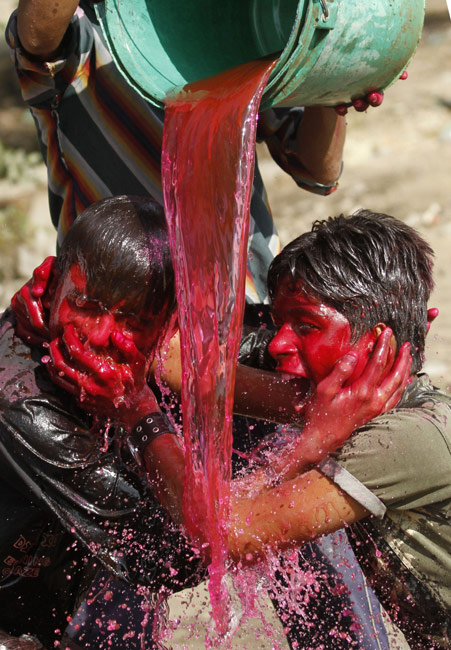 2月28日,印度举行庆祝洒红节活动,人们互撒颜料以示祝福。 洒红节是印度最盛大的节日之一,在每年2月至3月间举行。按照传统习俗,人们会在自己的脸上和身上涂抹颜料,还向别人身上抛撒彩色颜料和粉末。