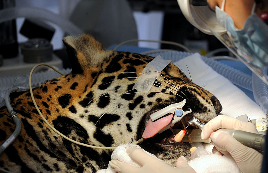 3月13日,在哥伦比亚麦德林附近的一个兽医诊所,一只雌性美洲虎在接受牙齿手术。图片来源:中国新闻网
