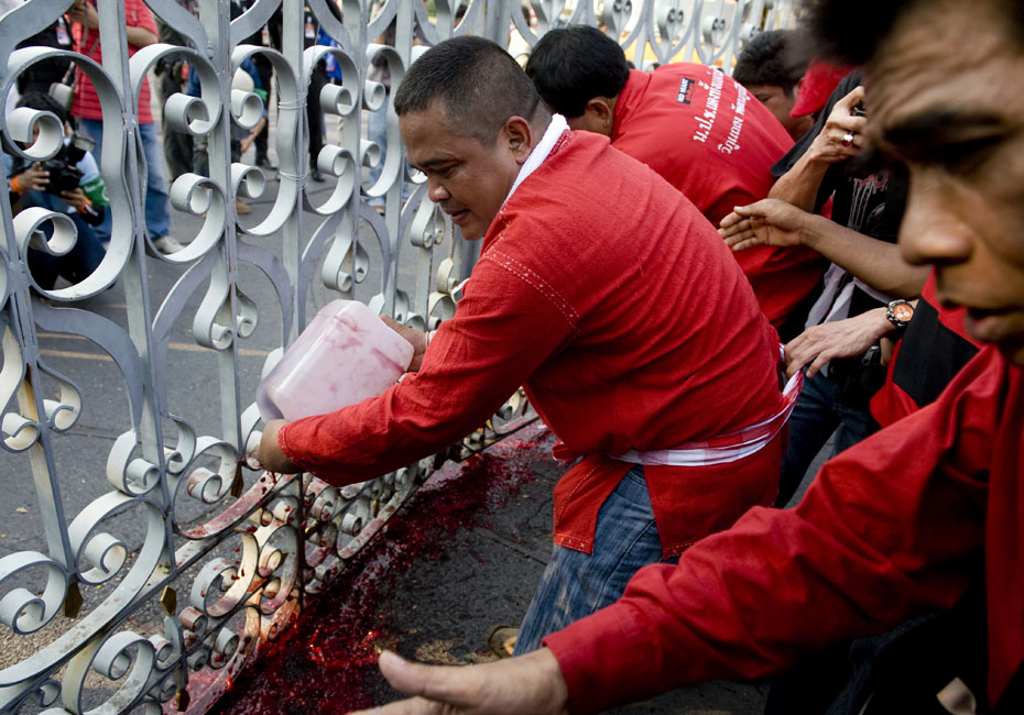 泰国反政府组织“红衫军”成员将血液泼洒在曼谷总理府门前,以此向政府施压要求解散国会下议院。图片来源:中国新闻网
