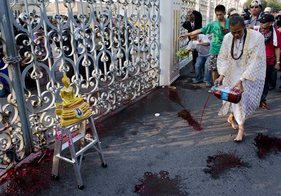 泰国反政府组织“红衫军”成员将血液泼洒在曼谷总理府门前,以此向政府施压要求解散国会下议院。图片来源:中国新闻网