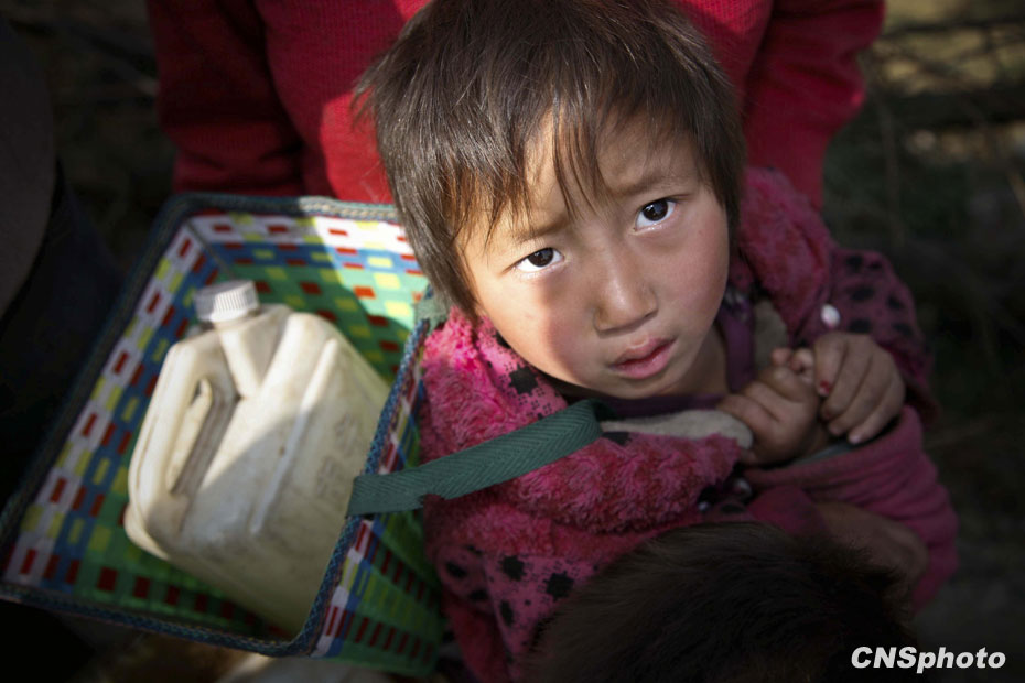 3月12日,在云南省富源县小羊场村口等待取水的儿童。中新社发 刘冉阳 摄