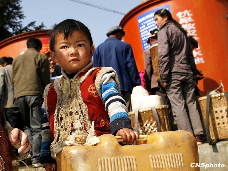 3月12日,在云南省富源县小羊场村口等待取水的儿童。中新社发 刘冉阳 摄