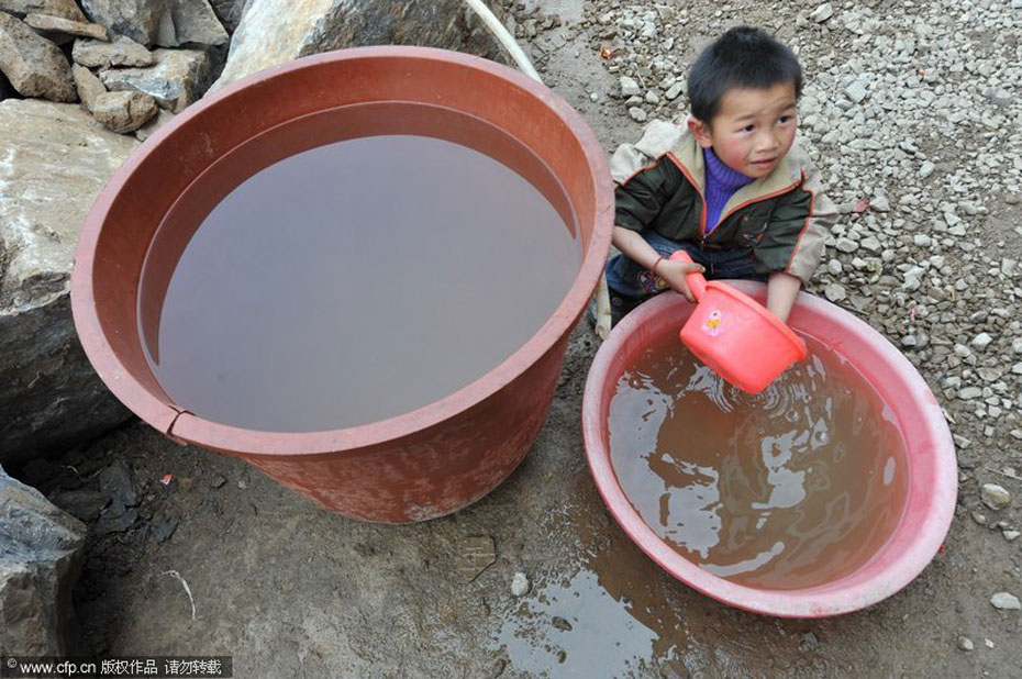 3月16日,贵州省开阳县城关镇青西村村民付燕子带着孩子在水库底找水。连日来,贵州省旱情加剧,贵阳市郊开阳县城关镇居民饮水源青西村水库几乎干涸。贵州省开阳县城关镇青西村一儿童在接水。吴东俊/CFP