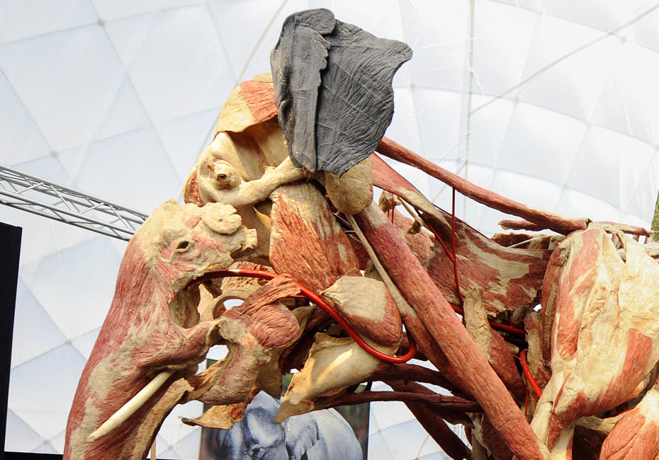 德国著名解剖学家巩特尔·冯·哈根斯博士被称为“死亡先生”,目前展出的是有史以来的最大的动物尸体。体型巨大的“桑芭”尸体高3.5米,重3.2吨。据悉“桑芭”将于2010年4月归还诺因基兴动物园。图片来源:中国新闻网