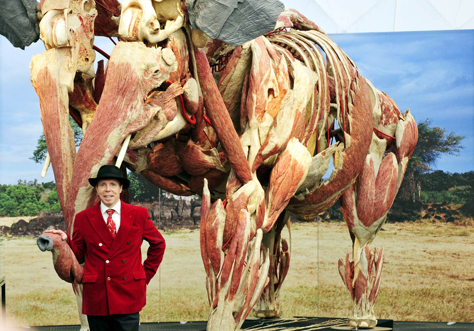 德国著名解剖学家巩特尔·冯·哈根斯博士被称为“死亡先生”,目前展出的是有史以来的最大的动物尸体。体型巨大的“桑芭”尸体高3.5米,重3.2吨。据悉“桑芭”将于2010年4月归还诺因基兴动物园。图片来源:中国新闻网