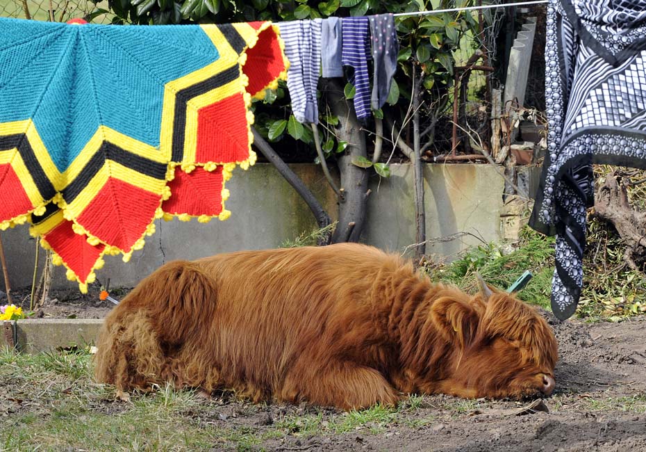 3月18日,德国一头苏格兰高地牛来到一居民院内懒洋洋的晒太阳,最后经过兽医的麻醉和消防员协力才将这头蛮力十足的家伙“制服”。图片来源:中国新闻网