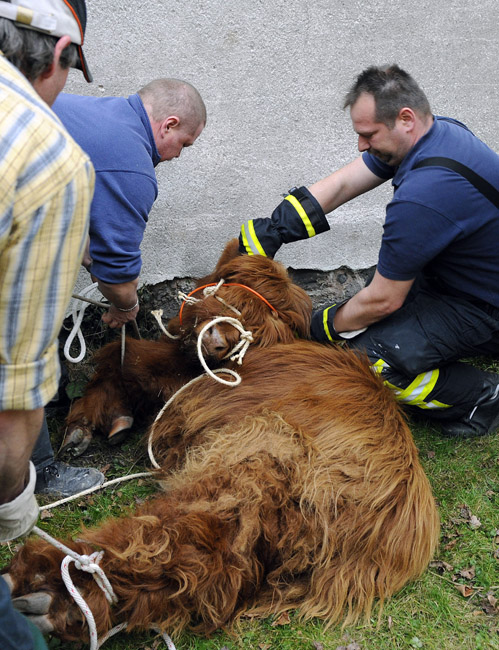 3月18日,德国一头苏格兰高地牛来到一居民院内懒洋洋的晒太阳,最后经过兽医的麻醉和消防员协力才将这头蛮力十足的家伙“制服”。图片来源:中国新闻网