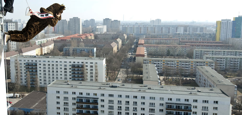 3月18日,在德国柏林举行的“高楼漫步”活动中,一名女子打扮成熊的模样(柏林的象征)在天使酒店外墙上行走,参加活动的人都有绳索保护。