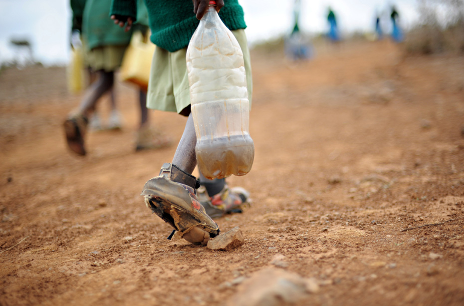 09年8月17,肯尼亚,一所学校的男孩穿着破旧鞋子,携带装着河水的塑料瓶。