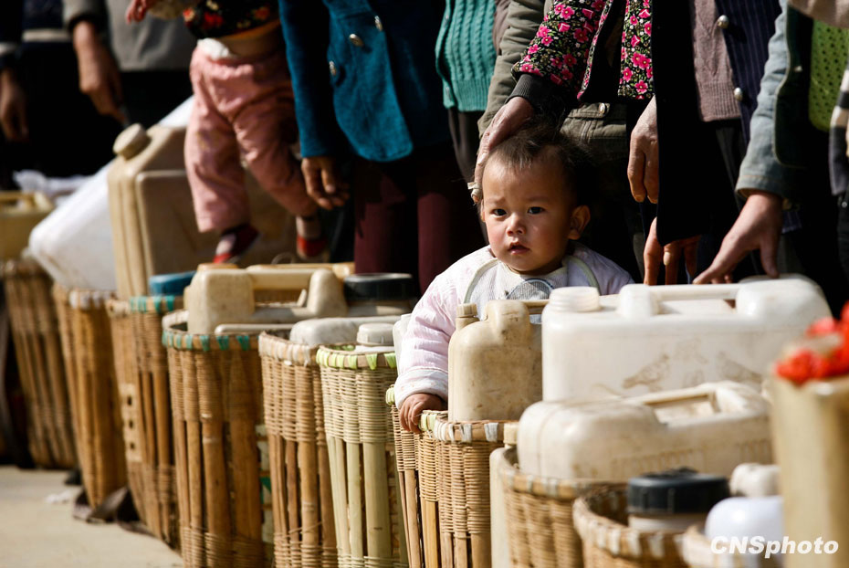 3月12日,云南省富源县小羊场村,1名儿童随母亲来到村口排队取水。中新社发 保旭 摄