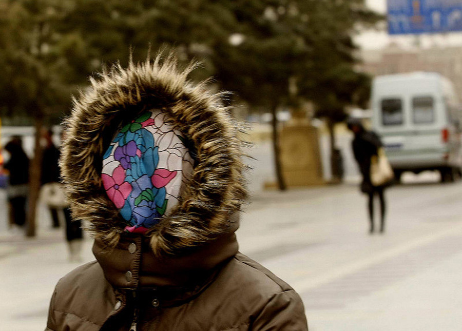 20日,北京遭遇4年来最强浮尘袭击。一位行人将自己用纱巾“武装”起来。