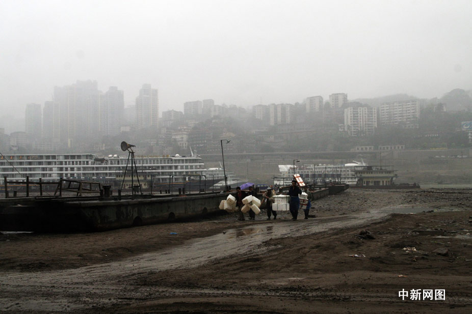 3月23日,重庆市朝天门嘉陵江与长江交汇处大面积河床裸露出来,部分水段已见底。图片来源:中国新闻网