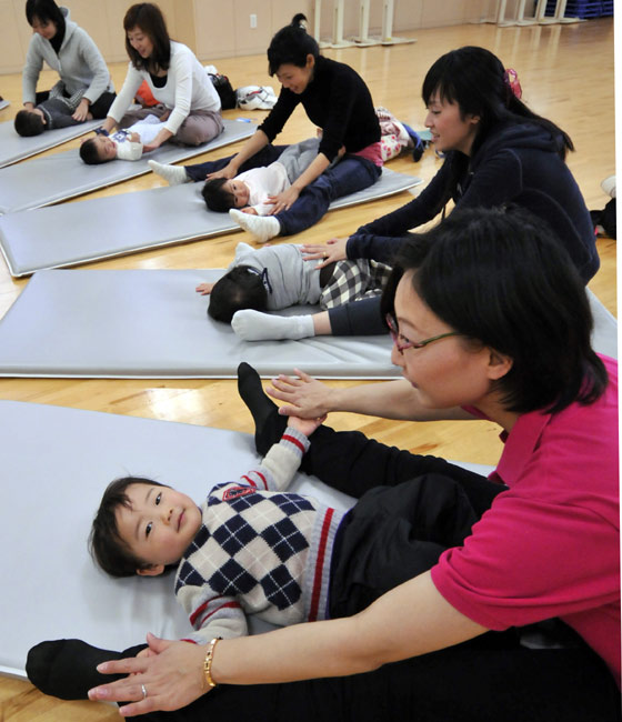 3月24日,在日本横滨市的一堂母婴桑巴课上,妈妈们带着自己的宝宝一起参加舞蹈训练。 凡是孩子年龄在三个月到两岁之间的母亲都可以到这里参加母婴舞蹈课,课程包括桑巴、华尔兹、布鲁斯等。