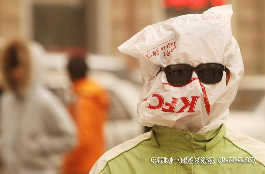 22日上午,在北京马甸桥附近,为防沙尘,一位要体面地去参加面试的小伙子用塑料袋套住脑袋,还戴上墨镜。图片来源:中国新闻网>>点击观看详细内容