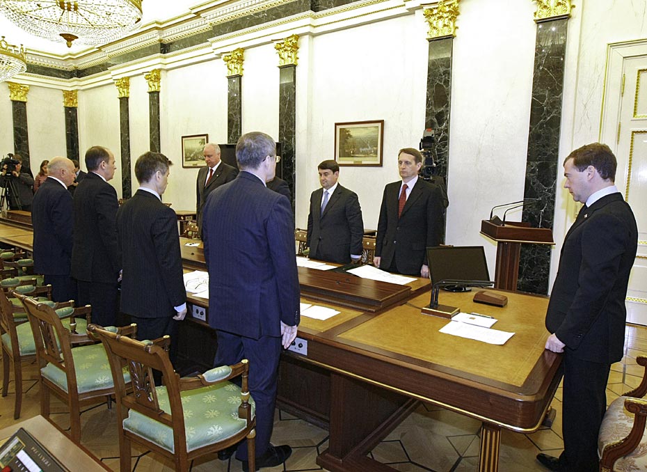 图为俄罗斯总统梅德韦杰夫在召开会议前为爆炸遇难者默哀。