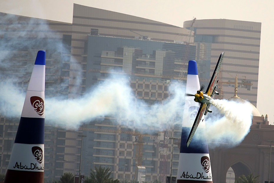 近日,红牛飞行系列赛世界锦标赛预选赛在阿拉伯联合酋长国阿布扎比举行。参加比赛飞行员不但要有高速的驾驶技术,还要有勇往直前的胆量。图片来源:中国新闻网