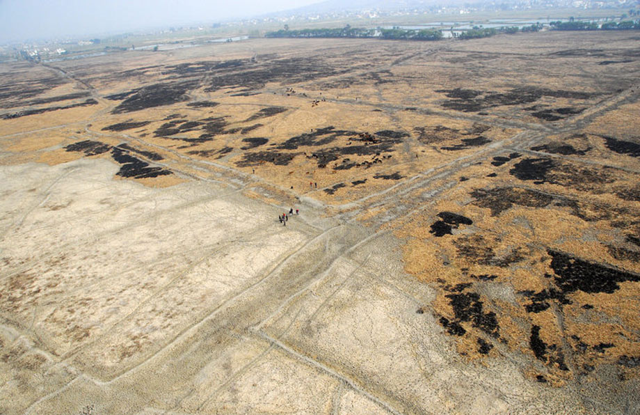 图为2010年3月27日,干涸的大理祥云县青海湖。目前云南的旱情仍然在加重,云南省防汛抗旱指挥部的最新数据显示,截止到3月26号全省饮水困难的人口已经达到了828万,比一周前增加了10多万人口。 小 智 摄