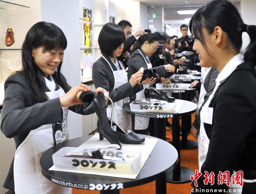4月1日,日本一家鞋油厂新员工在入职仪式上为老员工擦鞋。图片来源:中国新闻网