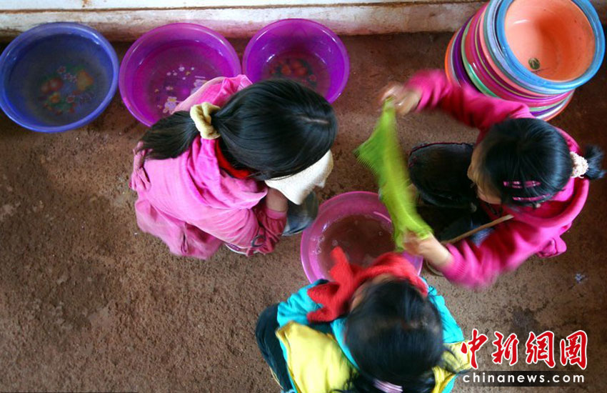 刘蕙玫和两个同学一起共用一个盆水洗脸,而这“盆”水只是两杯水。沙浪 摄