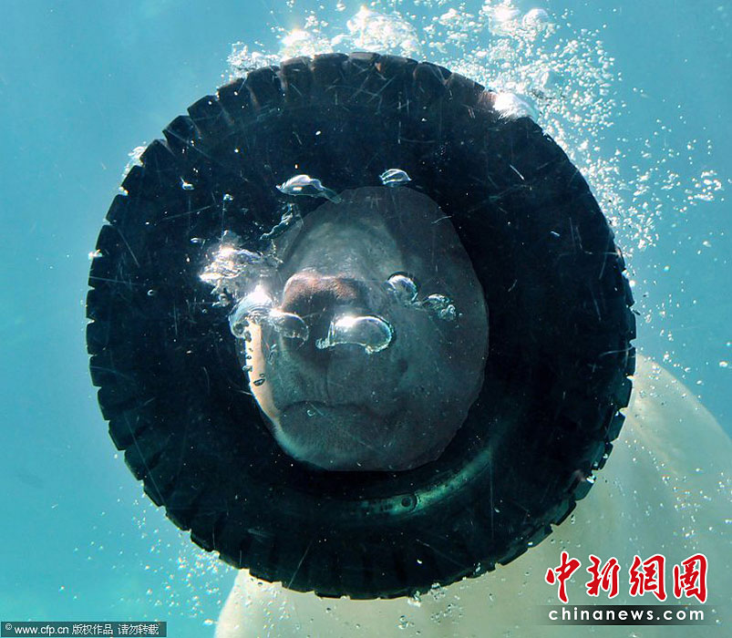美国Asheboro北卡罗来纳动物园一头名叫威利的北极熊可是个“活宝”。任何一个可用的东西都能成为它在镜头前“耍宝”的玩具。图片来源:CFP